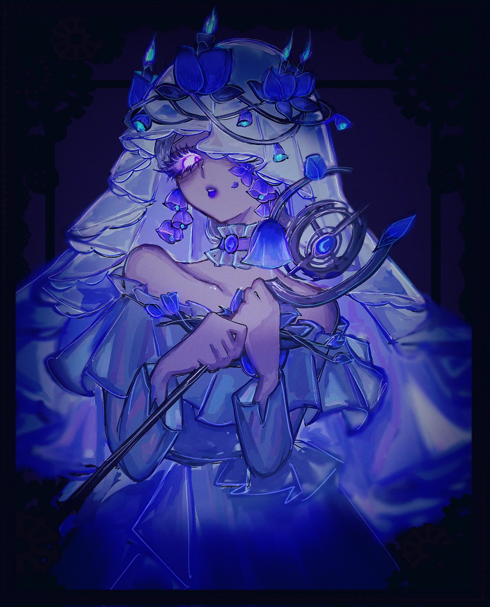 1girlblue firecandlechokercollarbonecolored eyelashesdresseyelashesfirefrilled chokerfrilled dressfrilled veilfrillsglowingglowing eyeshead wreathholdingholding staffoff shoulderpurple chokerpurple lipspurple themereki510solostaffupper bodyveilveil over one eyewhite eyelasheswhite eyeswhite veil