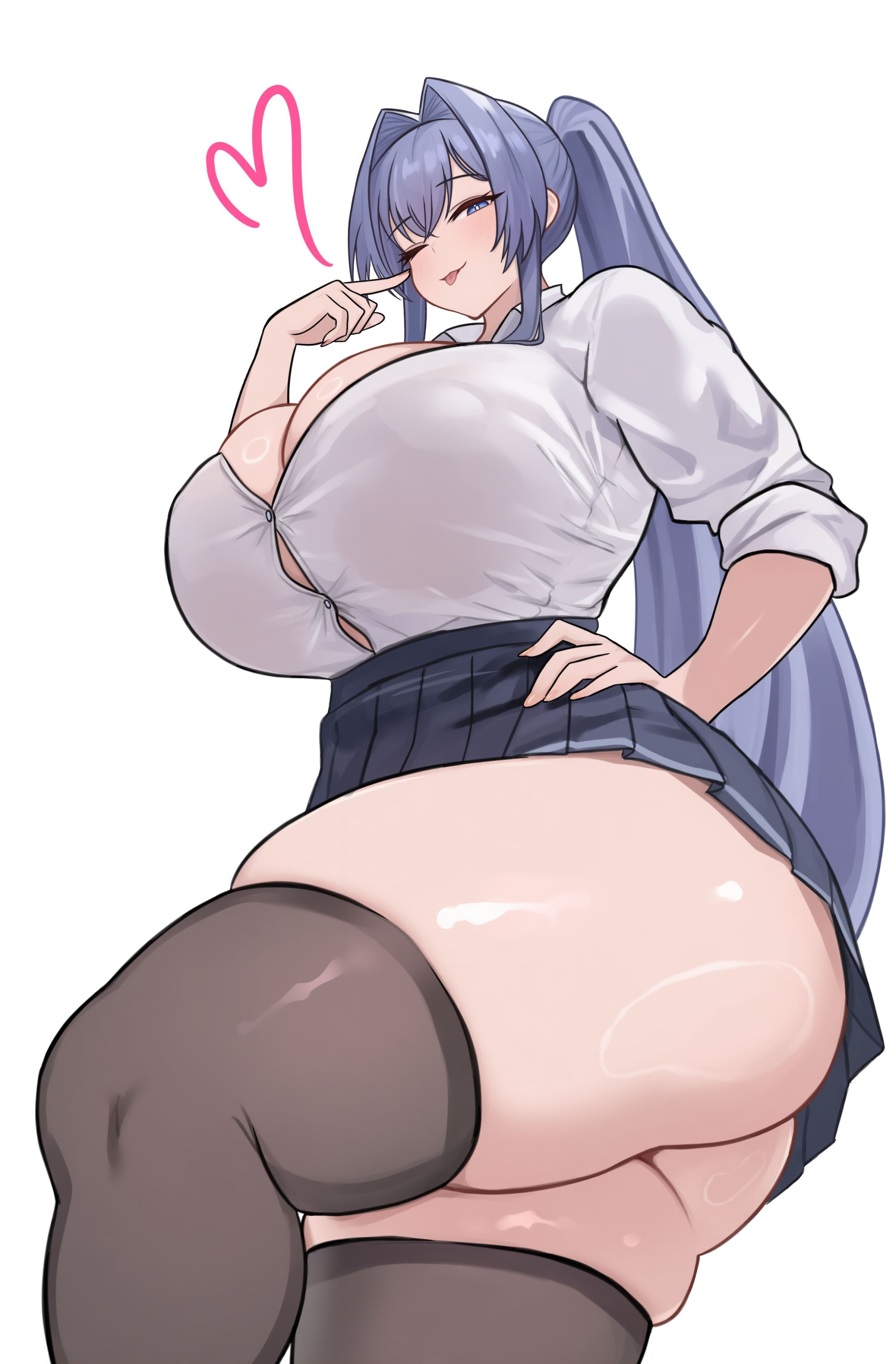 :p1girlblack skirtblack thighhighsblue eyesblue hairbreastsbursting breastsclosed mouthhair between eyeshair intakeshand on own hiphearthuge breastslooking at viewerone eye closedpleated skirtplumpponytailshirtsidelockssimple backgroundskirtsleeves rolled upsolostandingthick thighsthighhighsthighstonguetongue outwhite backgroundwhite shirt