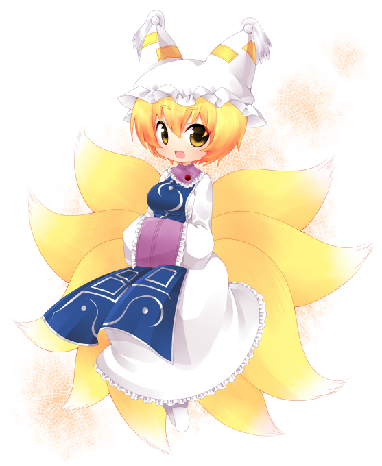 1girlanimal hatblonde hairfemale focusfox tailhands in opposite sleeveshatlong sleevesmob capmultiple tailsopen mouthshort hairsolotabardtailtasselwhite backgroundwide sleeves