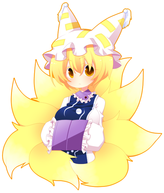 1boy1girlanimal hatblonde haircolored eyelashesfemale focusfox tailhands in opposite sleeveshatlong sleeveslooking at viewermob capmultiple tailsshort hairsimple backgroundsolotailtasselupper bodywhite backgroundwide sleevesyellow eyes