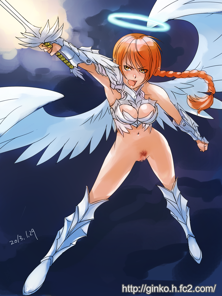 angelangel wingsarmorbottomlessbreastscleavageFlag for Deletionopen mouthorange hairpubic hairpussysoloswordwarriorweaponwingsyellow eyes