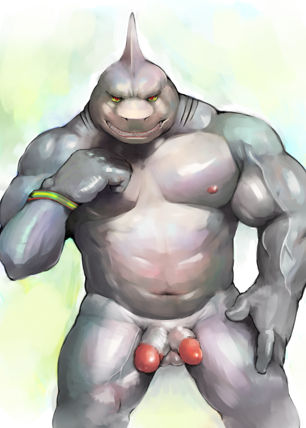 baldbicepsclothedclothingerectionfangsfinfishfistFlag for Deletionfurrygaygillsgumshalf-dressedhappylooking at viewermalemarinemusclesnudepecspenisplain backgroundraised armred eyessharksharp teethsmileteethtoplesswristband