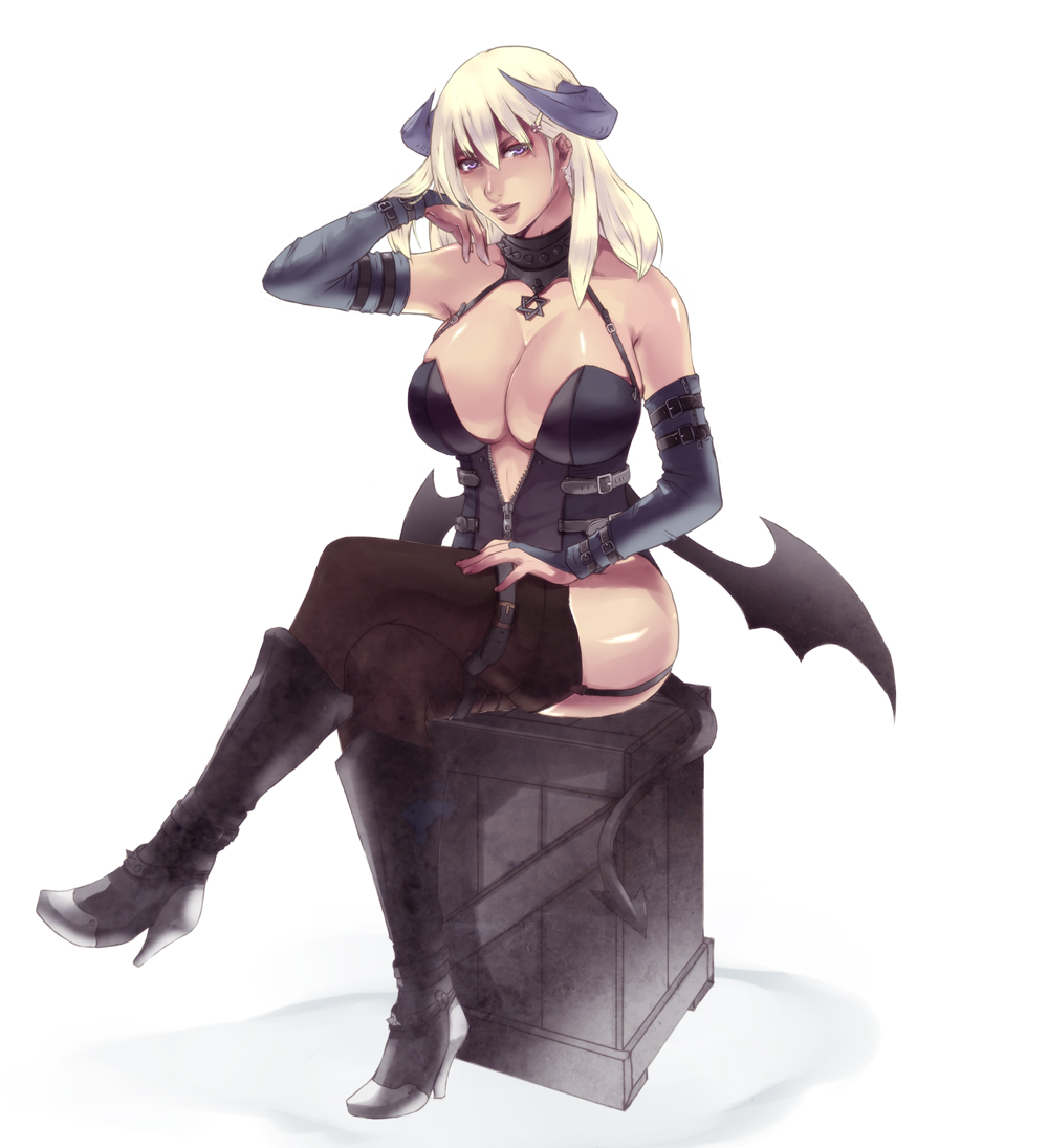 1girladjusting hairbare shouldersbat wingsblack thighhighsblonde hairbootsboxbreastsbridal gauntletscleavagecollarcrossed legsdemon girldemon tailelbow glovesfemale focusgloveshigh heelshornshuge breastslarge breastslegslipslong hairpurple eyesshoessittingsmilesolotailtanthighhighsunzippedwings