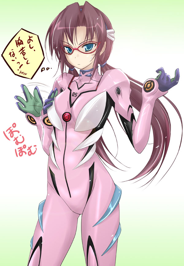 00s1girlafterimageblue eyesbodysuitbreast paddingbrown haircowboy shotfemale focusglassesglovesgradient backgroundgreen backgroundhairbandhand on breastlong hairlooking at viewerlow twintailsmecha pilot suitparted bangsplugsuit (evangelion)purple hairred-framed eyewearscrunchieserioussolospeech bubbleturtlenecktwintailsvery long hair