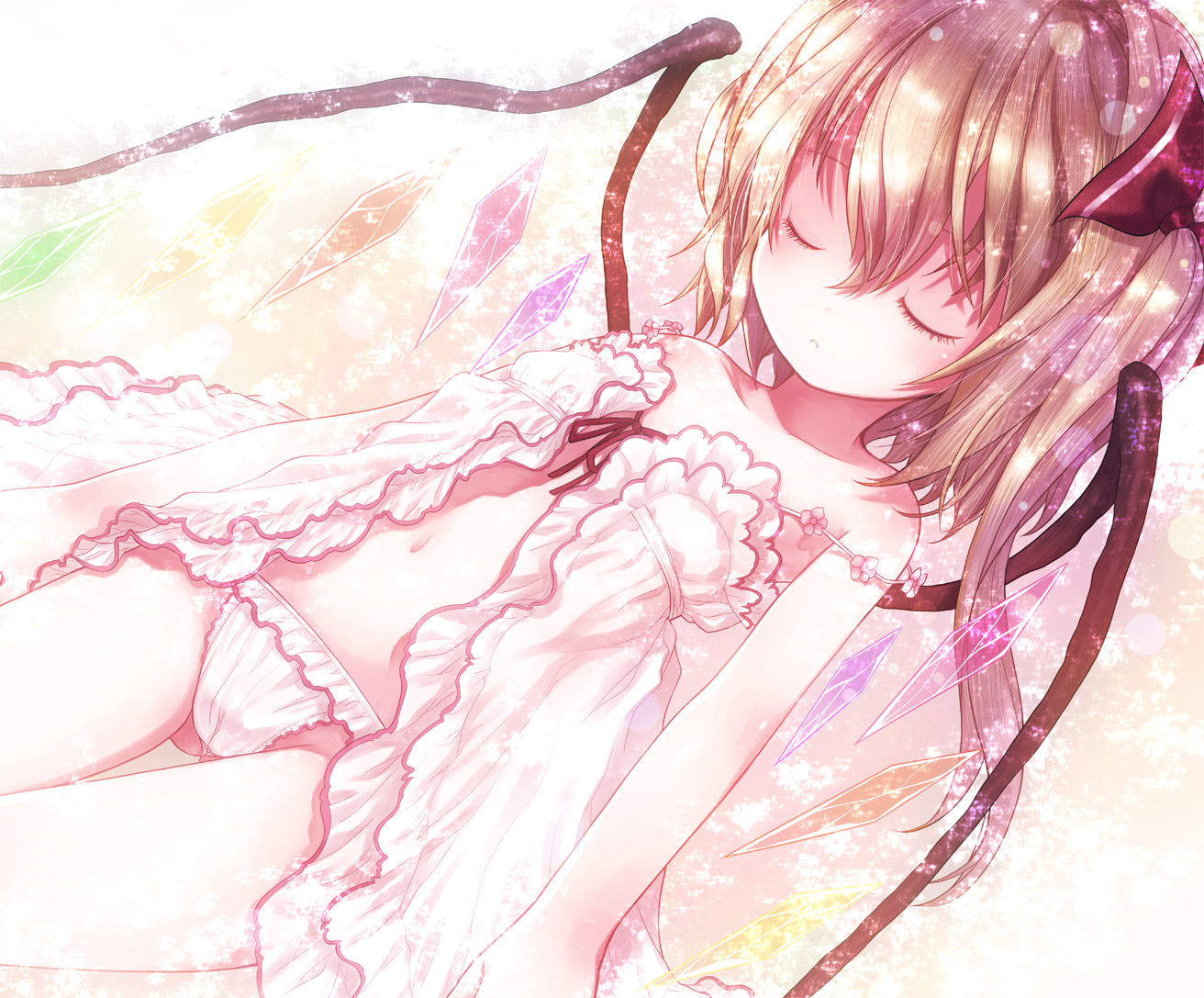 1girlasymmetrical hairbabydollblonde hairclosed eyesfemale focuslingeriemidriffnavelpantiesponytailshort hairside ponytailsleepingsolostrap slipunderwearwings