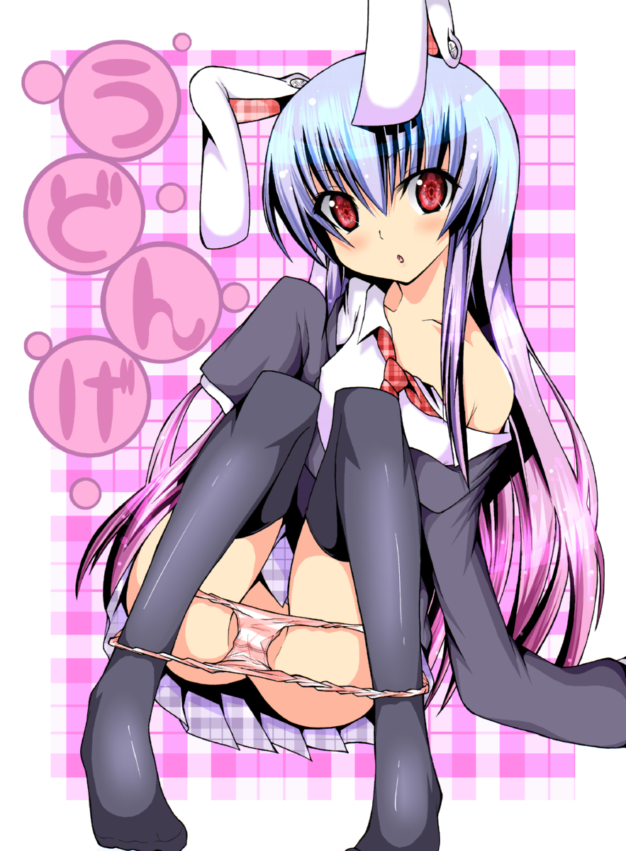 1girlanimal earsbare shouldersfemale focuslong hairnecktieoversized clothespantiespanty pullrabbit earsred eyessolostriped clothesstriped pantiesthighhighsunderwear