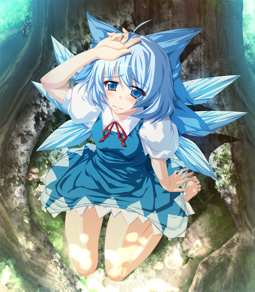 1girlbarefootblue dressblue eyesblue hairbowbreastsdressfemale focusmatching hair/eyesribbonshort hairsittingsolotearstreewings