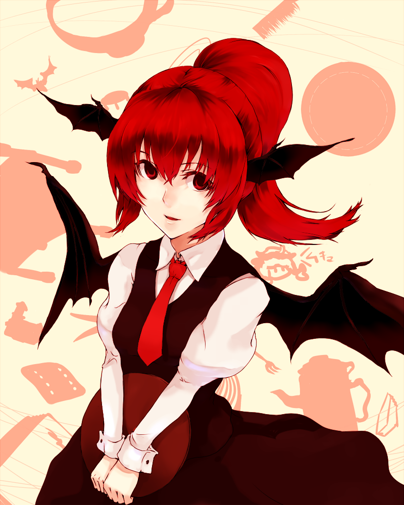 1girlalternate hairstylebat wingsfemale focushead wingsponytailred eyesred hairshort hairsolowings