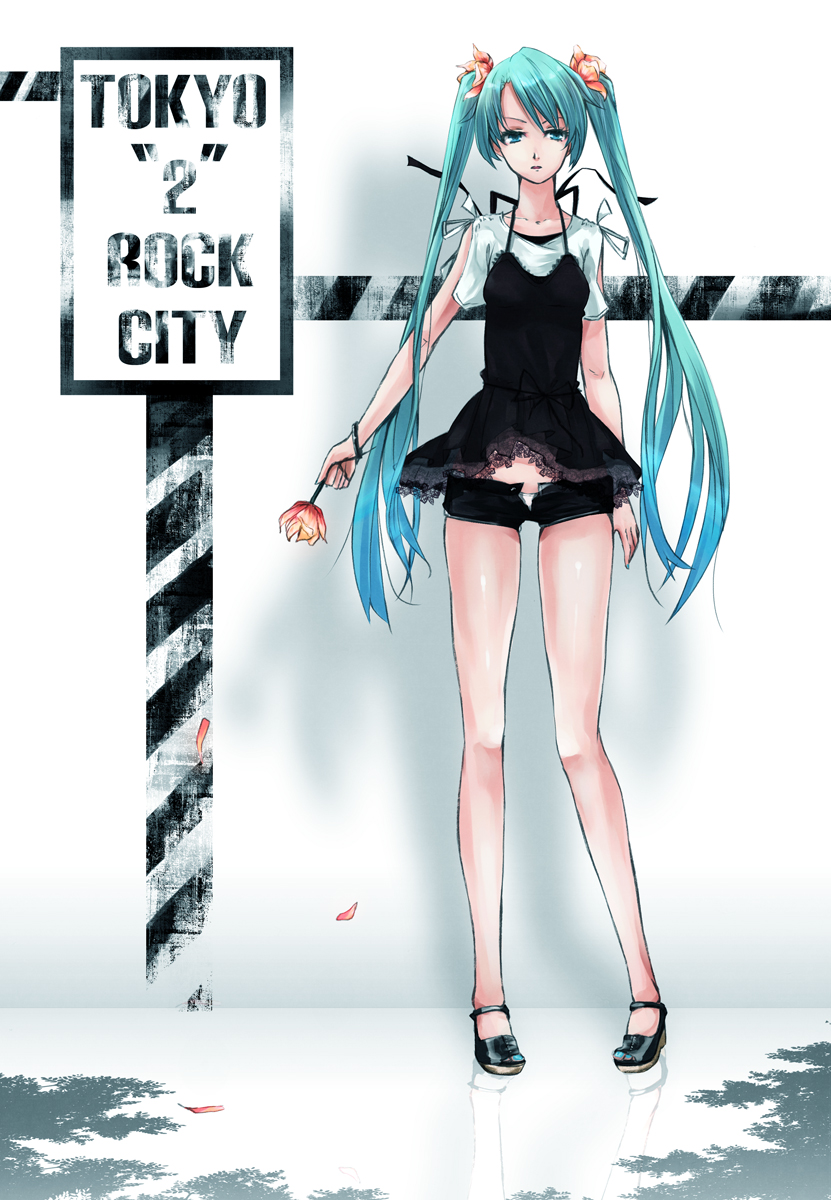 1girlaqua eyesaqua hairdressfemale focusflowerlegsopen flyopen shoespigeon-toedreflectionrelfectionshort shortsshortssolotoestwintailsunzipped