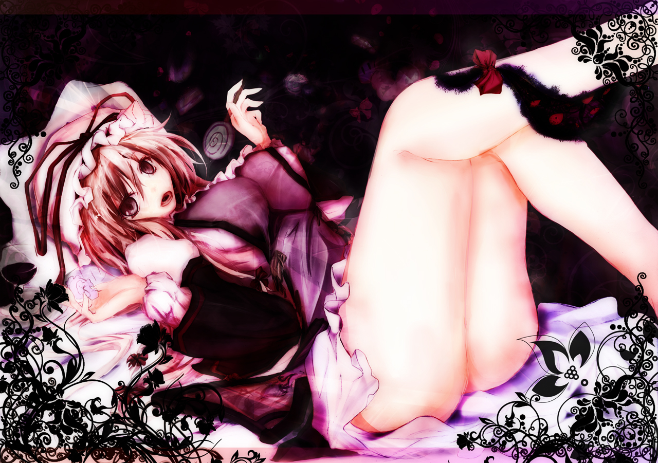 1girlblonde hairbreastscandyfemale focusfoodgap (touhou)hatlong hairlyingmouth holdpurple eyessolo