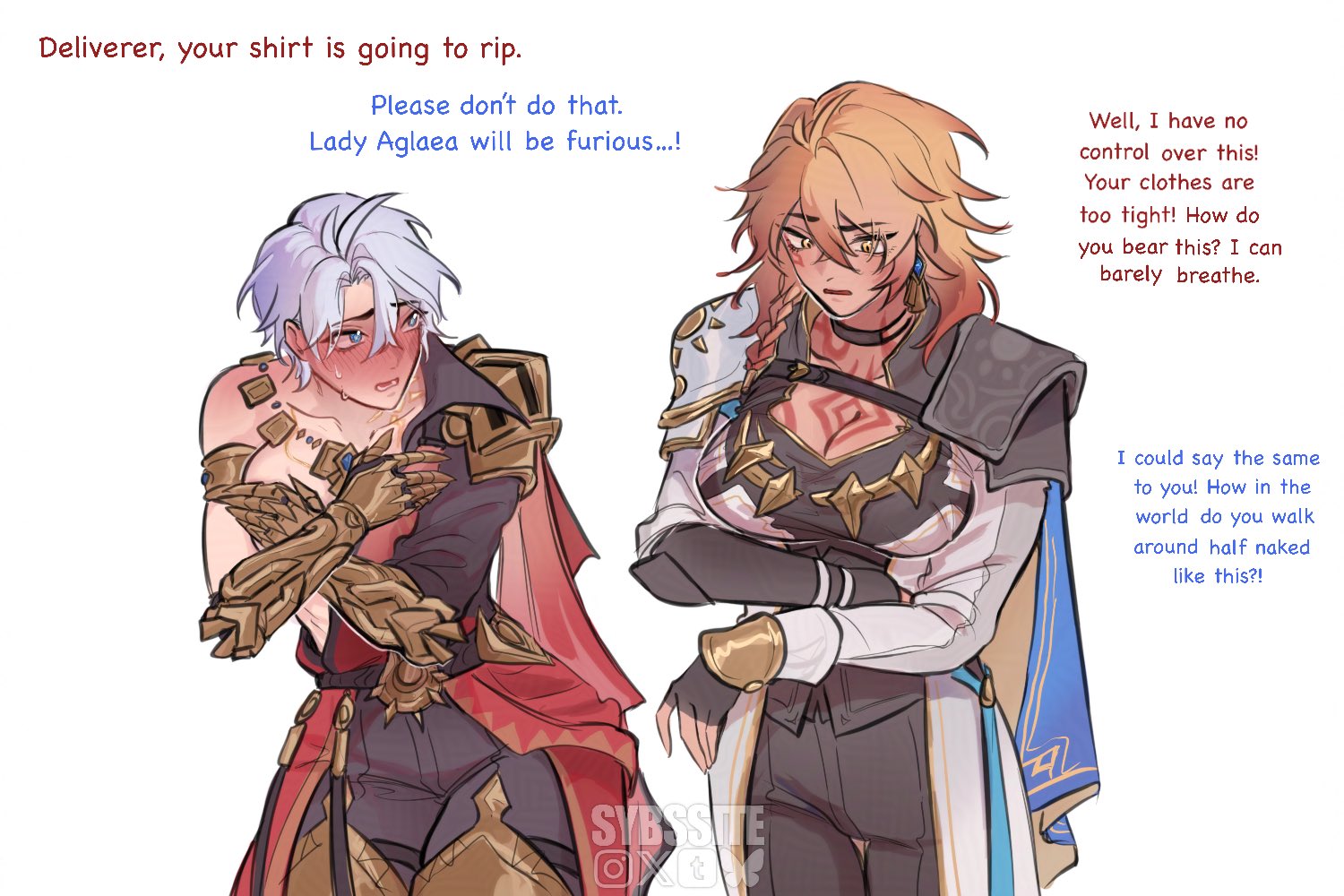 2girlsantenna hairarmorarms under breastsartist nameblack chokerblack pantsblonde hairblue eyesblushbraidbreast tattoobreastschokercleavagecosplaycostume switchcovering breastscovering privatescowboy shotcrossed wristsearringsembarrassedenglish textfull-face blushgauntletsgenderswapgenderswap (mtf)gold necklacegradient hairhair between eyesjewelrylarge breastslong hairlooking at anothermulticolored hairmultiple girlsmydei (honkai: star rail) (cosplay)neck tattoonecklaceopen mouthpantspauldronsphainon (honkai: star rail) (cosplay)red hairred tattooshort hairshoulder armorside braidsimple backgroundsingle bare shouldersingle earringsingle pauldronsun symbolsun tattoosweattantattoowatermarkwhite backgroundwhite hairyellow eyes