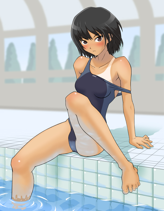 1girlarm supportbare shouldersbarefootblack hairblushbrown eyesbrown haircausticscompetition swimsuitfeetfemale focusfrownlooking at viewerone-piece swimsuitone-piece tanpoolpoolsidereflectionshort hairsittingsoaking feetsolospread legsstrap slipswimsuittantanlinewater