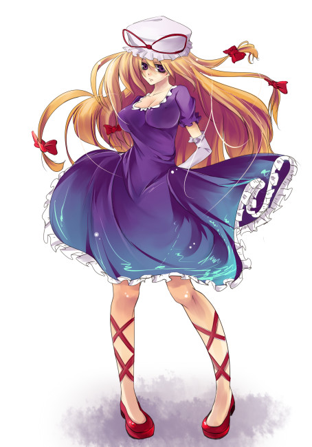 1girlblonde hairbowbreastsdresselbow glovesfemale focusfrilled dressfrillsgloveshatleg ribbonlong hairpurple dressribbonsimple backgroundsolo