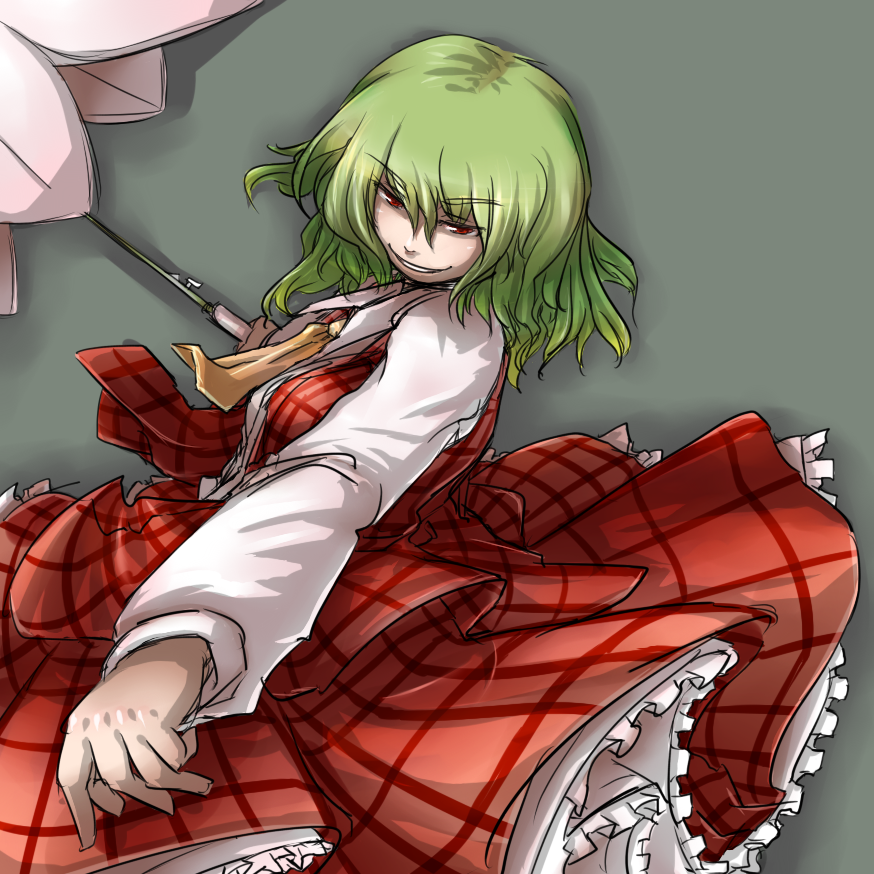 1girlascotevil smilefemale focusgreen hairgrey backgroundgrinkaren hakolong sleeveslooking at vieweroutstretched armsparasolpetticoatplaid clothesplaid skirtplaid vestred eyesshaded faceshort hairsimple backgroundskirtskirt setsmilesolospinningspread armsturning headumbrellavest