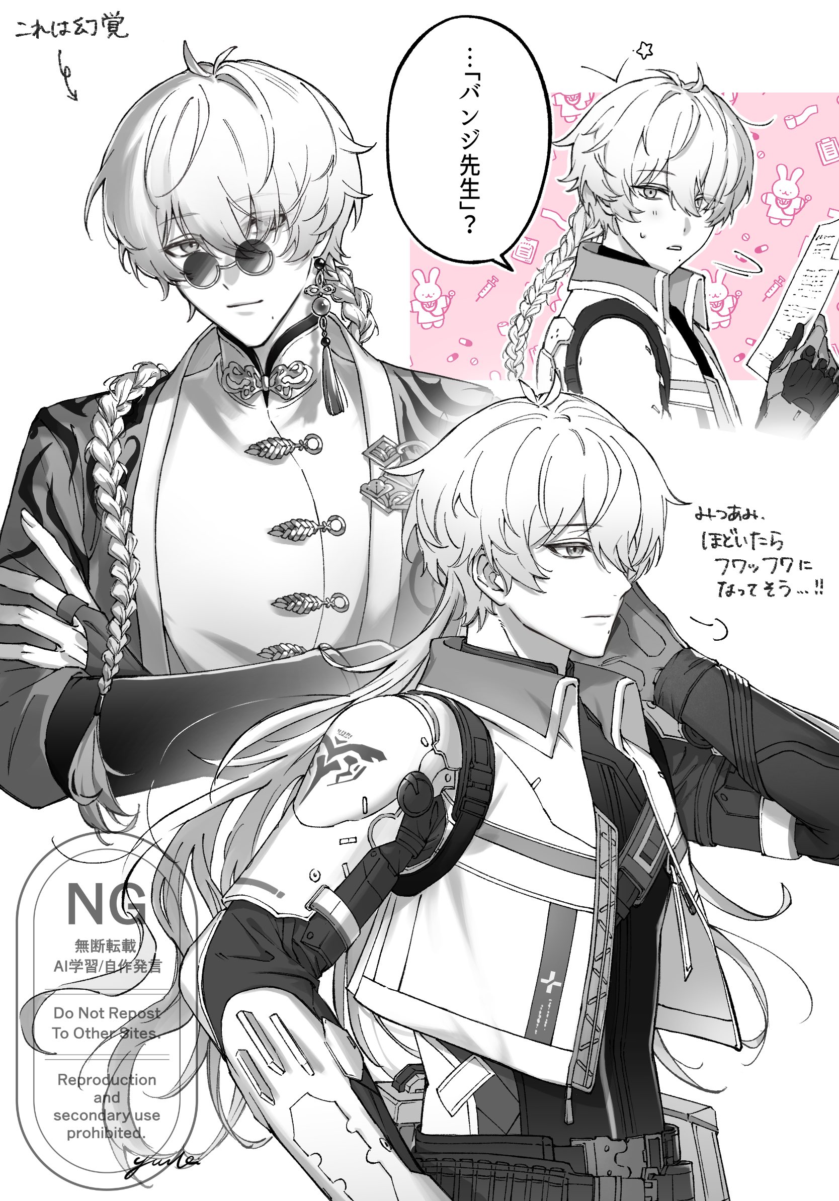 1boyandrogynousbeltbraidbridal gauntletschinese clothescropped jacketcrossed armsearringsglasseshair between eyeshair downhair over shoulderhand uphigh collarholdingholding paperjacketjewelrylogolong hairlooking at viewermale focusmandarin collarmechanical armsmolemole under mouthmonochromemultiple viewspaperpatterned clothingpearl earringspince-nezprofileround eyewearsleevelesssleeveless jacketsweatthree-quarter sleevesturning headwatermarkzipper