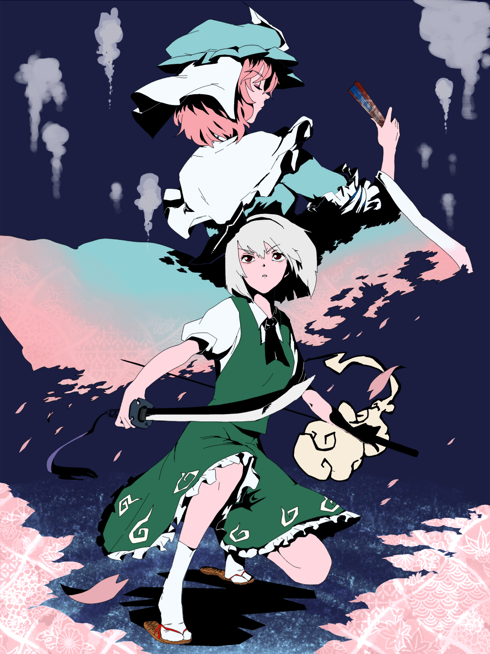 2girlsdual wieldingfemale focusghosthairbandhand fanhathitodamaholdingkatanamultiple girlspink hairred eyessandalsshort hairswordweapon