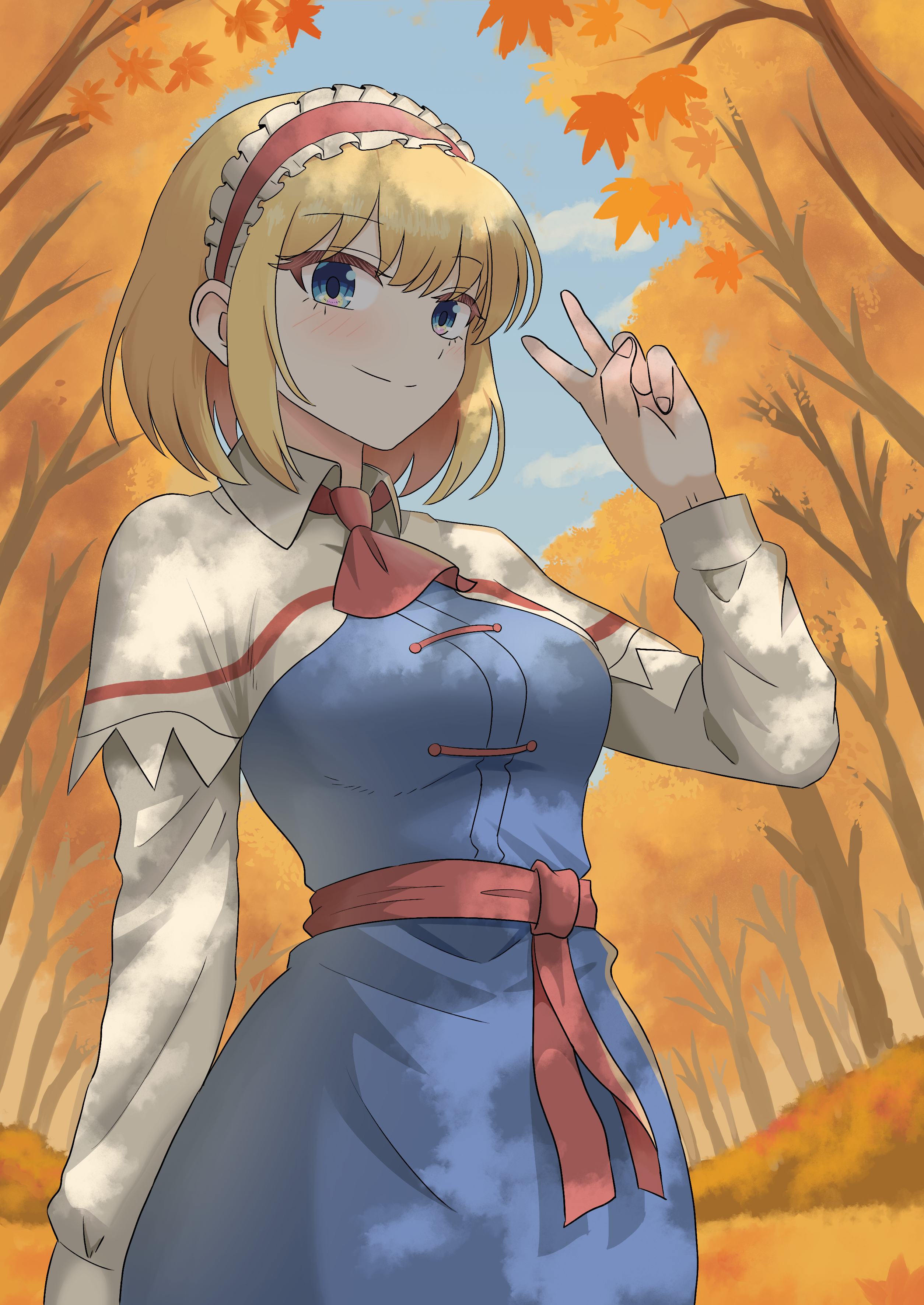 1girlascotautumnautumn leavesblonde hairblue dressblue eyesblue skyblushbreastscapeletclosed mouthdaydressfrilled hairbandfrillshairbandkiyo (tomoki6107)leaflolita hairbandlong sleeveslooking at vieweroutdoorsred ascotred hairbandred sashsashskysmilesolotreevwaist sashwhite capelet