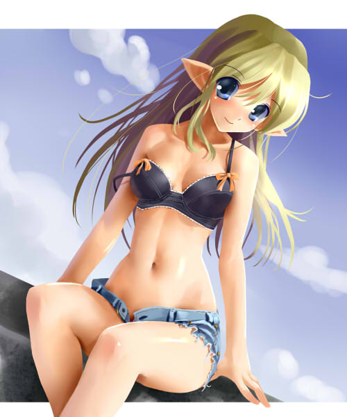 1girlblonde hairblue eyesbradenimdenim shortsdutch angleelffemale focuslingerielong hairnavelpointy earsshortssittingsmilesolostrap slipunbuttonedunderwear