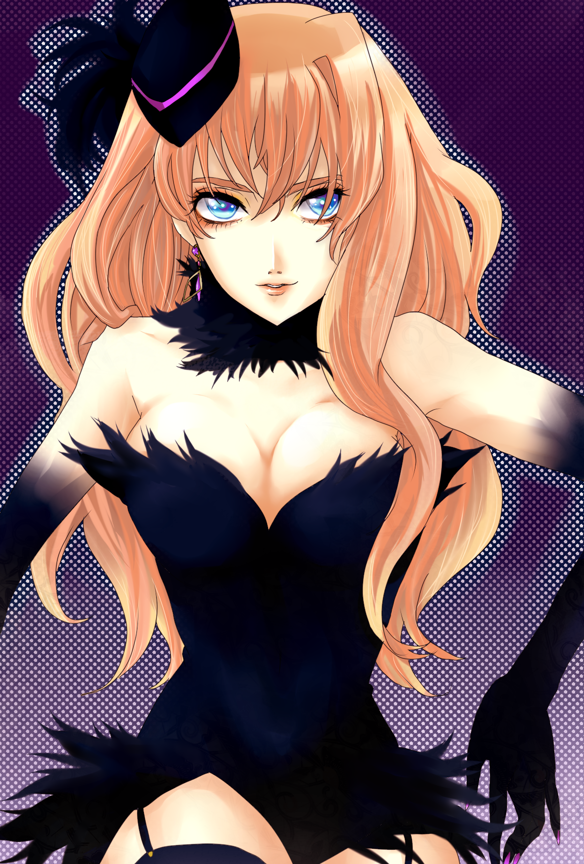 00s1girlbare shouldersblonde hairblue eyesbreastscleavageearringselbow glovesfemale focusgarter beltgloveshatjewelrylipslong hairnail polishpurple nailssolothighhighs