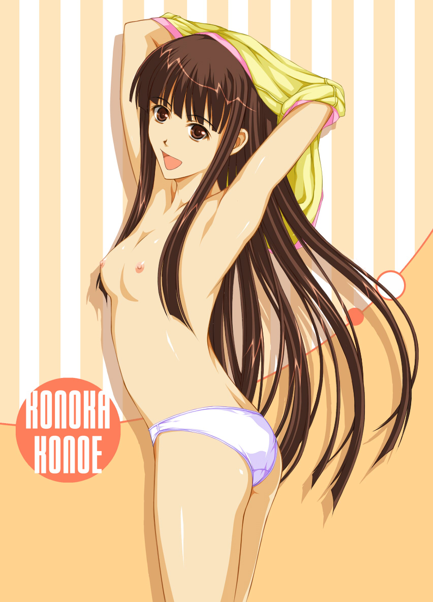 arisue tsukasa, lilica, usotsuki wa tenshi no hajimari, angel, blonde hair, blue eyes, blush, breasts, feathers, long hair, panties, shy, topless female, underwear, wings