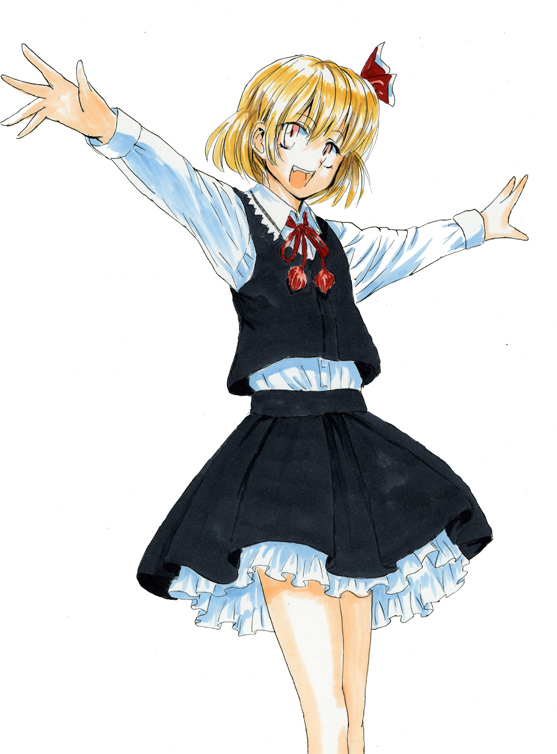 1girlblonde hairfemale focusoutstretched armsred eyesshort hairsimple backgroundsolospread armswhite background