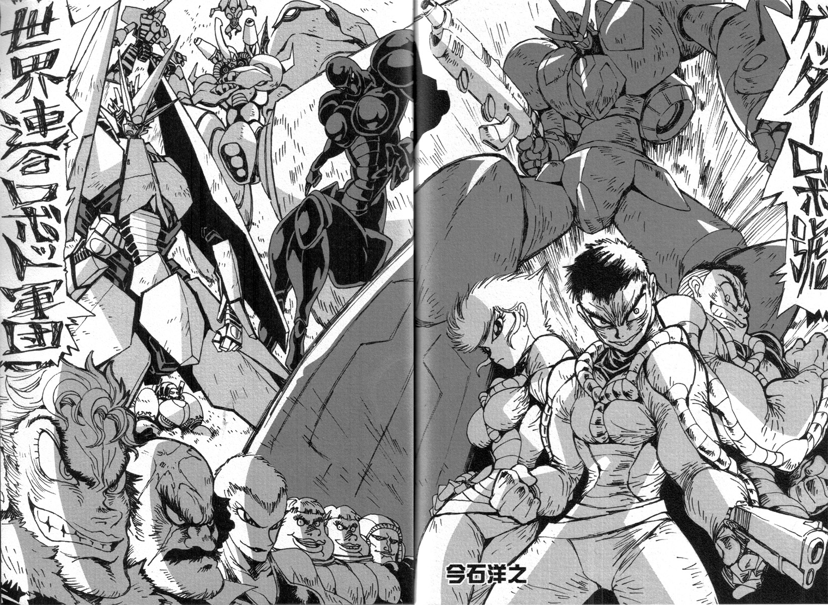 bodysuitbreastsclenched handcomiccreaseeveryoneevil grinevil smilefacial hairgringunhandgunlineupmechamuscularmustacheshort hairsmilesuper robotweapon
