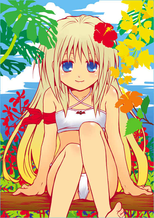 1girlarmbandbarefootbikiniblonde hairblue eyesdayfemale focusflowerhibiscuslong hairsoloswimsuittoeswhite bikini