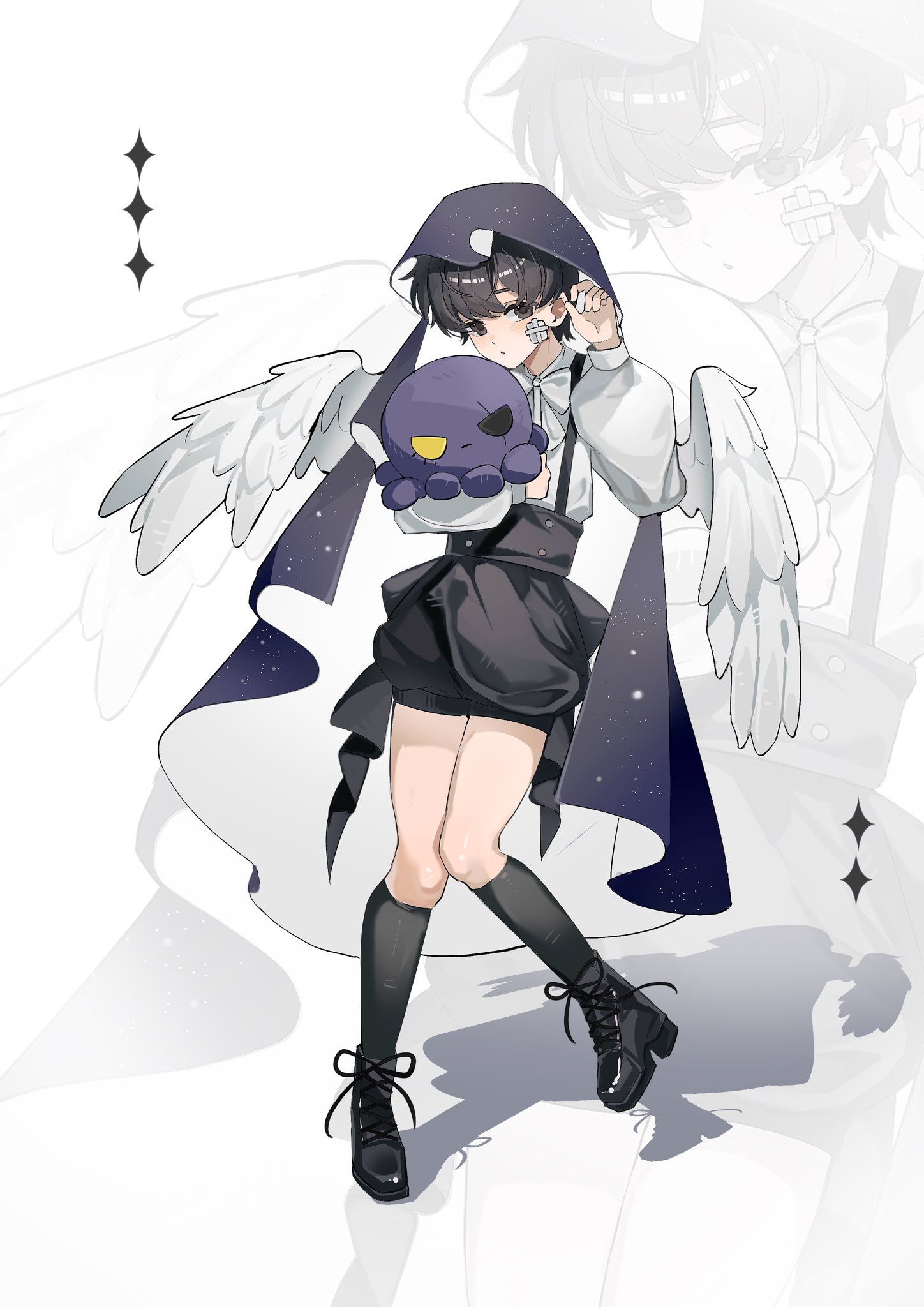 1boyalternate costumeanimalizationbaggy pantsbandage on facebandagesblack eyesblack hairbootscharacter dollchouxin233cloakdollfeathered wingshand uphoodhood uphooded cloakknees together feet apartlooking at viewermale focusoctopuspantsshirtshort hairstarry sky printstuffed animalstuffed toysuspenderswhite shirtwhite wingswingszoom layer