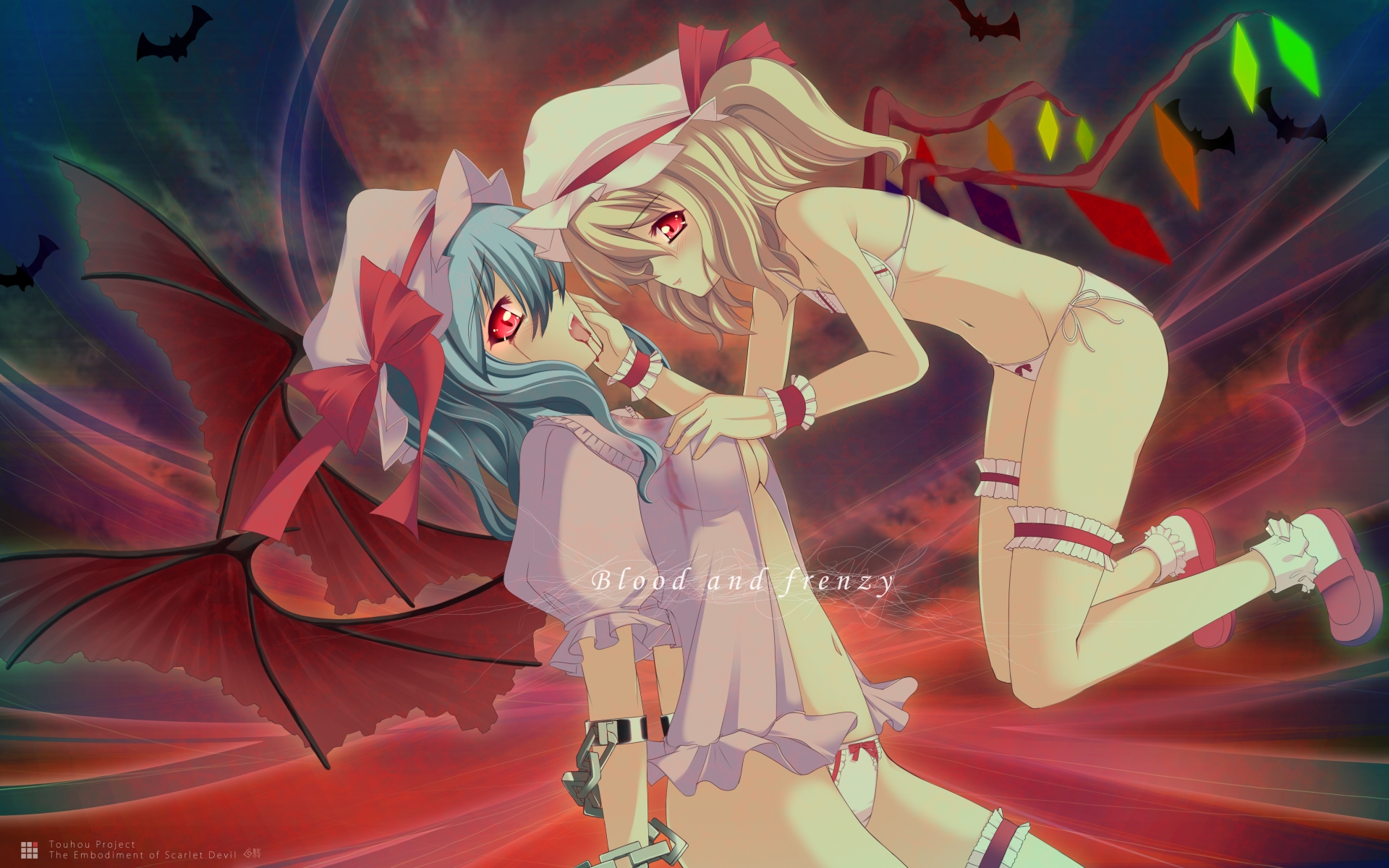 2girlsbat (animal)bat wingsbdsmblonde hairbloodblue hairblushbondageboundbrachainfangfrilled thigh straphatincestlingeriemoonmultiple girlspantiesrapered eyesshort hairsiblingsside ponytailside-tie pantiessisterstearsthigh strapunderwearunderwear onlywingswrist cuffsyuri