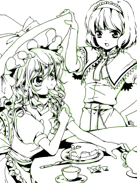 2girlscakecupeatingfemale focusfoodforkgreen themehatknifemonochromemultiple girlsopen mouthpastryplatesaucershort hairsittingstandingtableteacupteapot