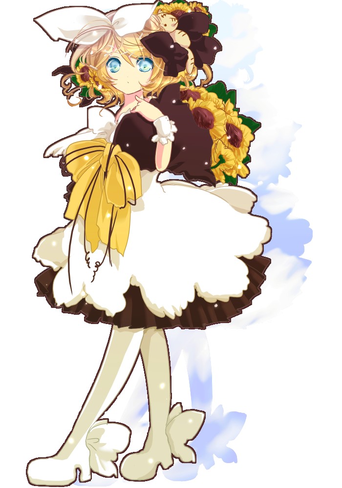 1girlblonde hairblue eyesdressfemale focusflowerfrillshair ribbonpantyhoseribbonshoesshort hairsolosunflower