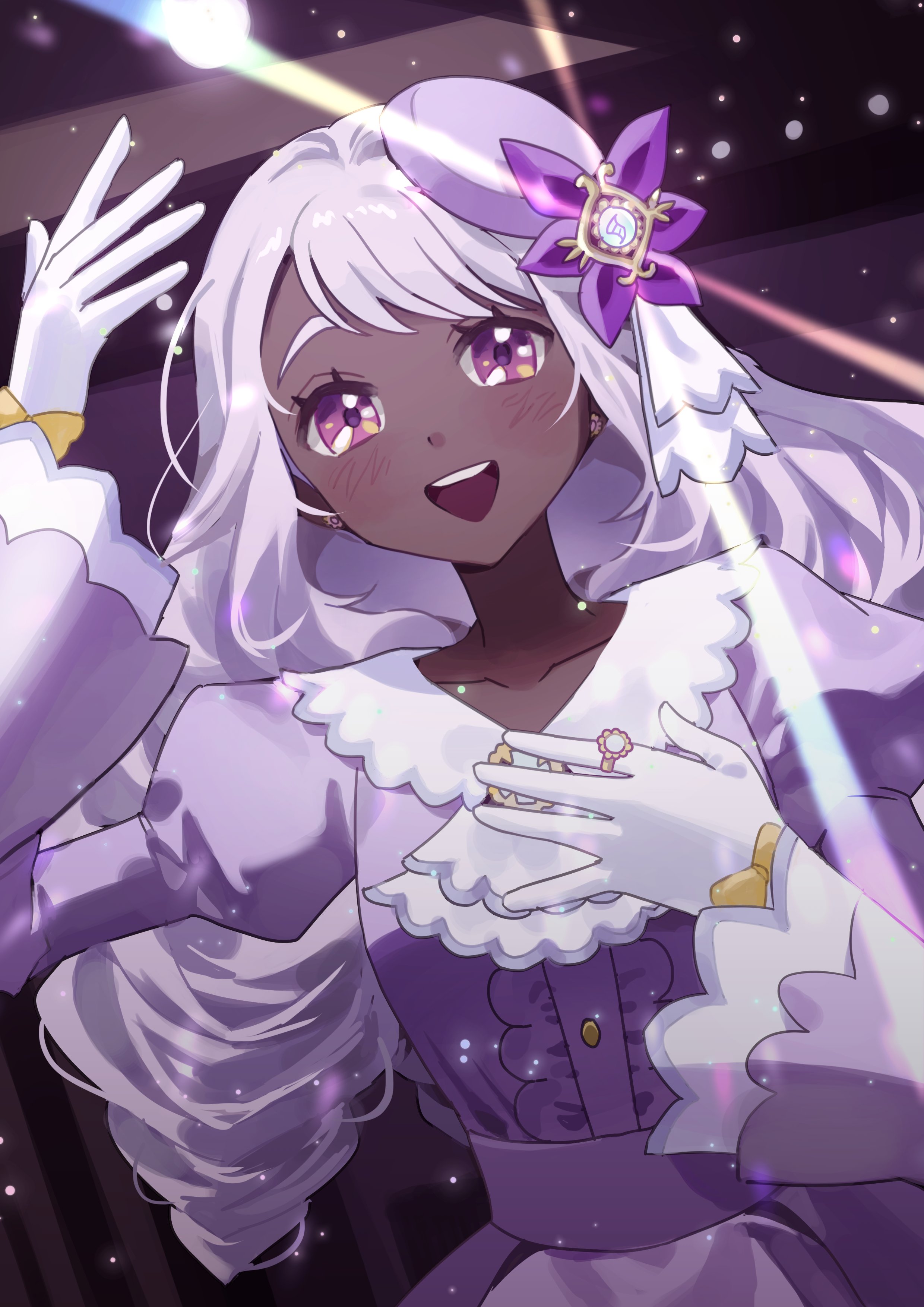 1girlascotblushdark skindark-skinned femaledressfascinatorfrilled ascotfrillsglove bowglovesgold ringjuliet sleeveslong hairlong sleeveslooking at viewerlow drillsmedi pokemega stoneopen mouthpuffy sleevespurple dresspurple eyespurple hairsmilesoloteethupper bodyupper teeth onlyvery dark skinwhite gloves