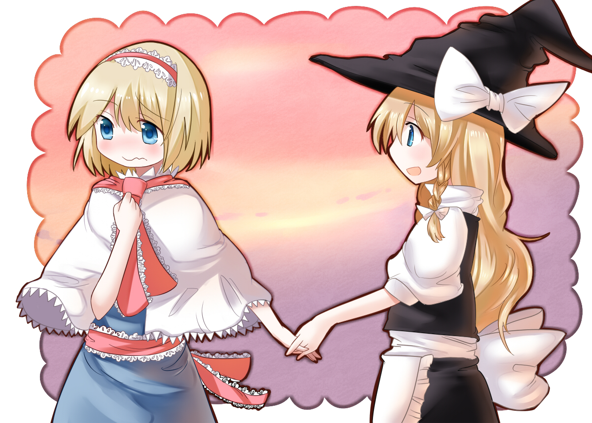 2girlsblonde hairblue eyesdressfemale focusgradient backgroundhairbandhatmultiple girlsribbonskirtsky
