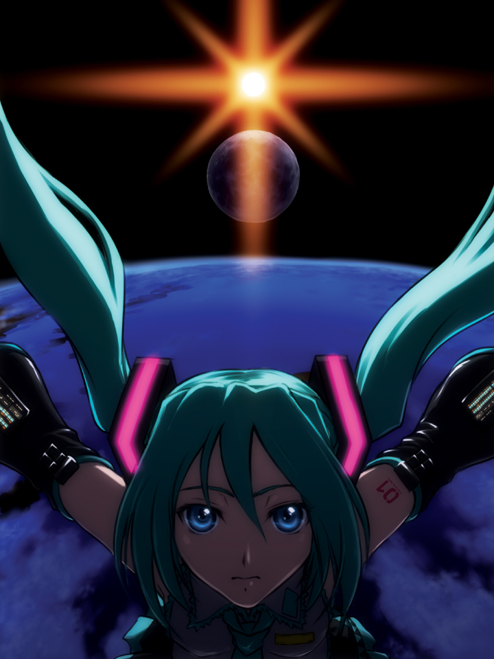 1girlblue eyesdetached sleevesearth (planet)female focusgreen hairlong hairmoonnecktieplanetskirtsolospacesuntwintails