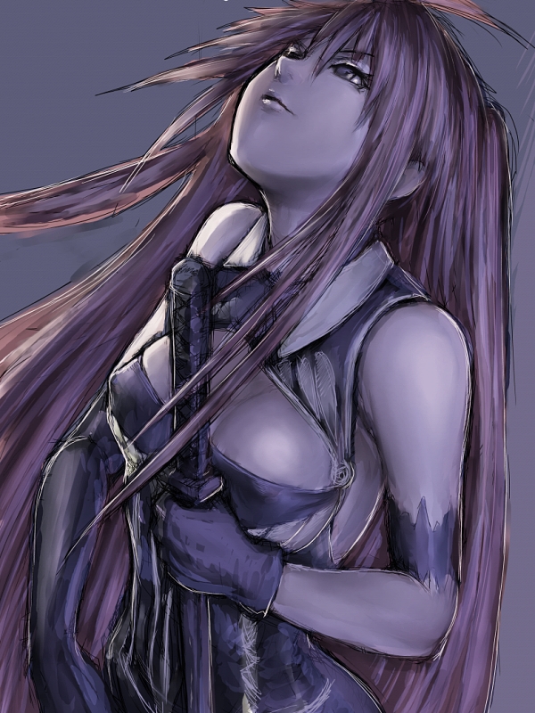 1girlbreastsbrown haircleavagecovered erect nippleselbow glovesfemale focusglovesgrey eyeslarge breastslong hairlooking upred hairsketchsoloswordweapon