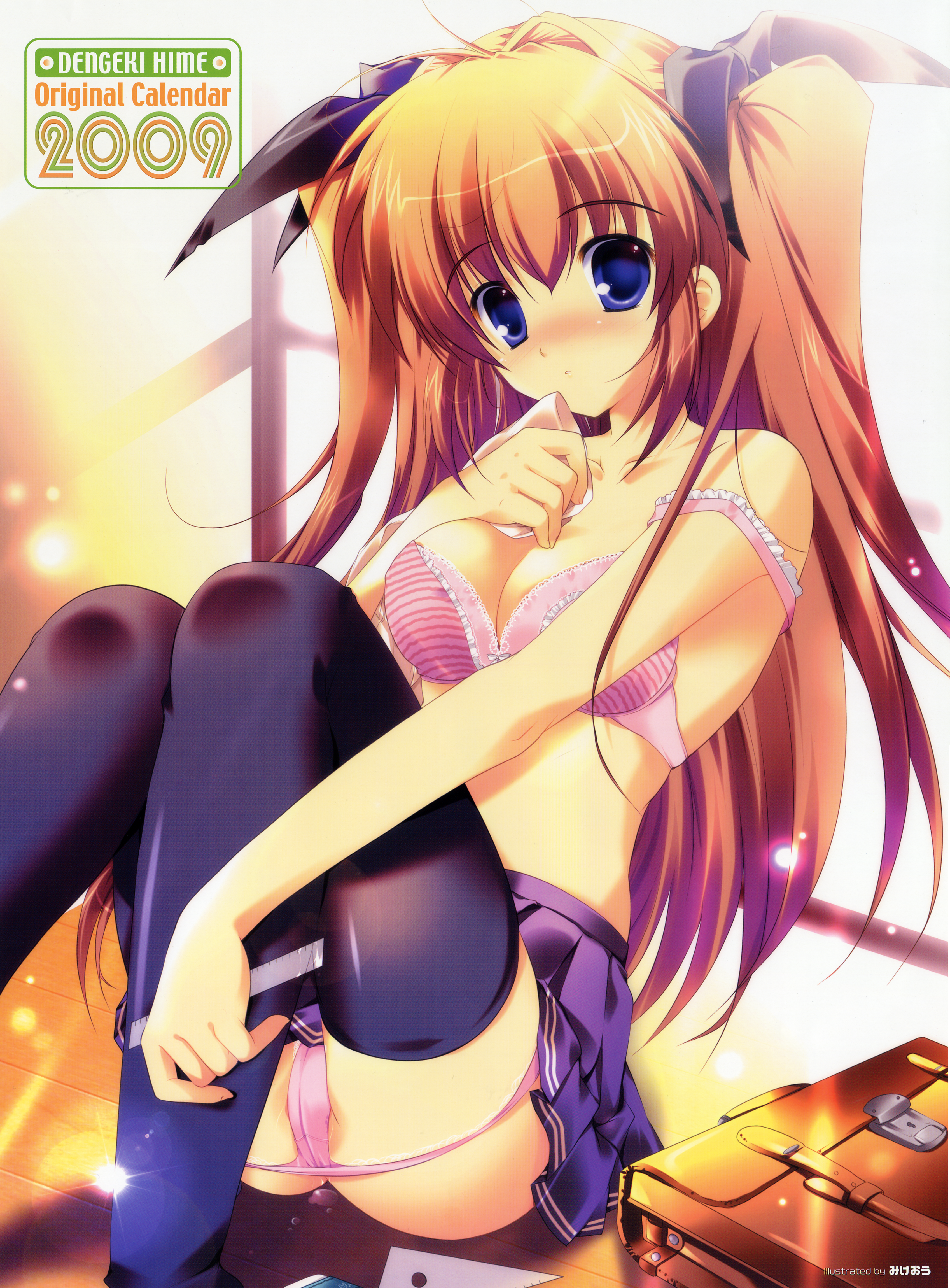 00s1girl2009bagblonde hairblue eyesblushbrabreastscalendarcleavagefemale focushair ribbonlarge breastslingeriepantiesribbonschool bagskirtsolothighhighstwintailsunderwear