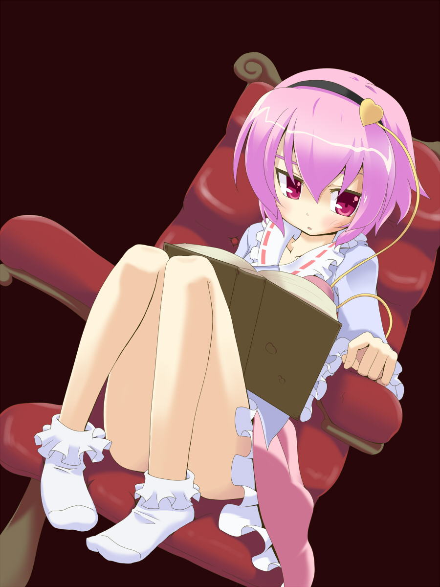 1girlblushbookchaircollarbonefeetfemale focushairbandheartlong sleevesopen mouthpink eyespink hairred eyesshort hairsittingsockssolo