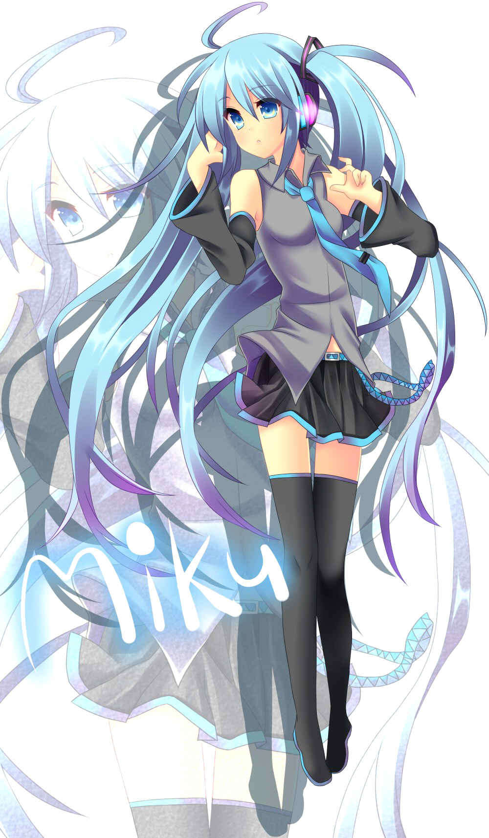 1girlahogeblue eyesblue hairdetached sleevesfemale focusheadphoneslong hairmatching hair/eyesnecktieskirtsolothighhighstwintailsvery long hairzettai ryouiki