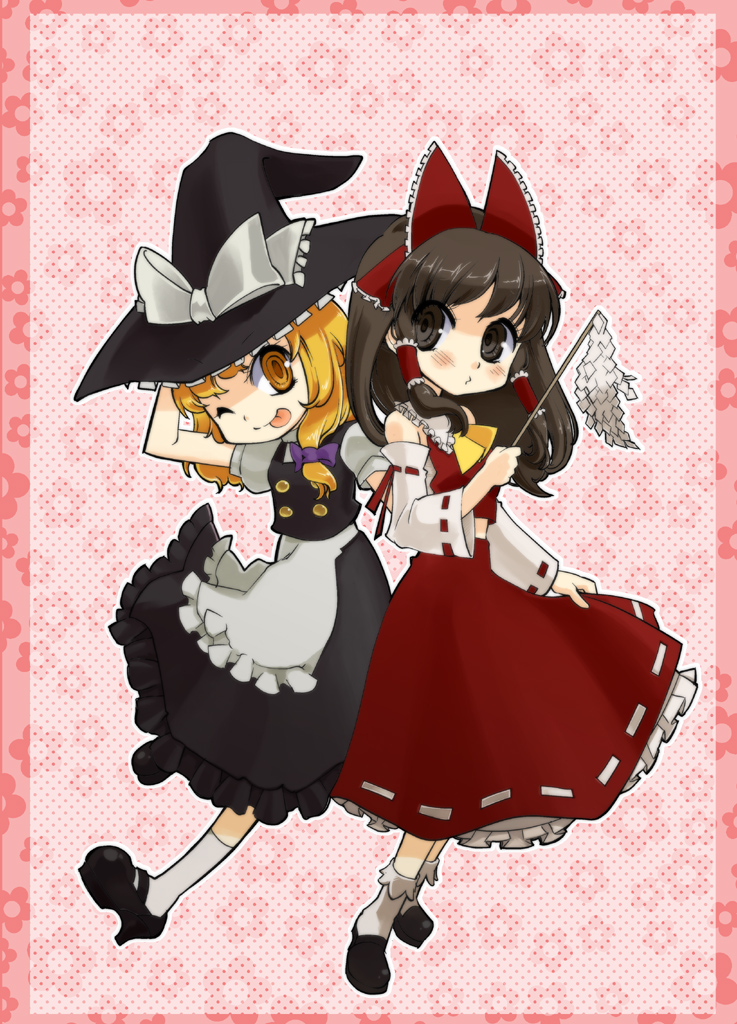 2girlsblonde hairbowbrown eyesbrown hairdetached sleevesfemale focusgoheihair bowhatjapanese clothesmikomultiple girlsoonusashort hairwitchwitch hatyellow eyes