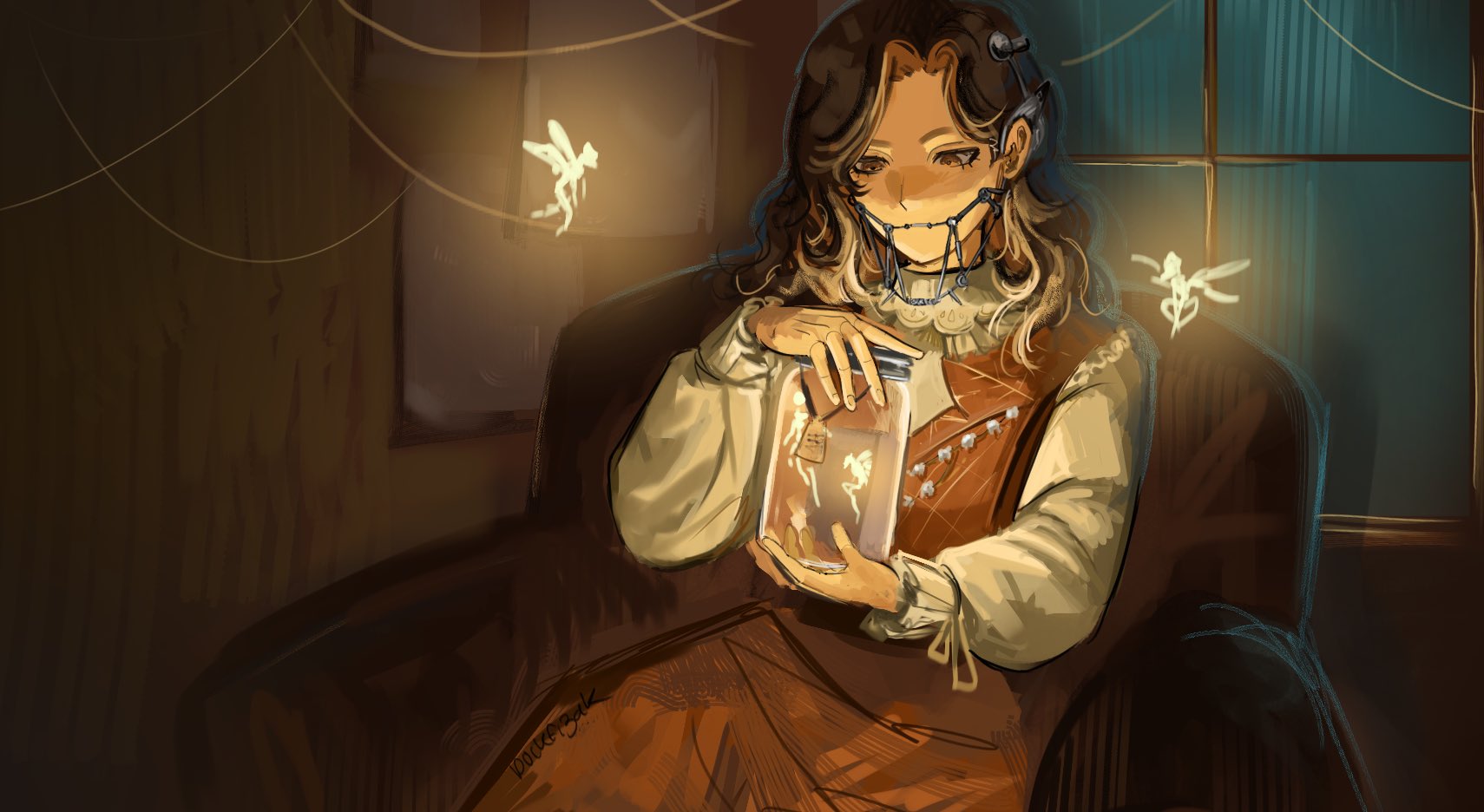 1girlbracesbrown eyesbrown haircouchcreaturedark backgrounddressfairyfragrance (freakyduck9000)glowingholdingholding jarindoorsjarlong hairlooking at objecton couchred dressshirtsittingsleevelesssleeveless dresssoloupper bodywhite shirtwindow