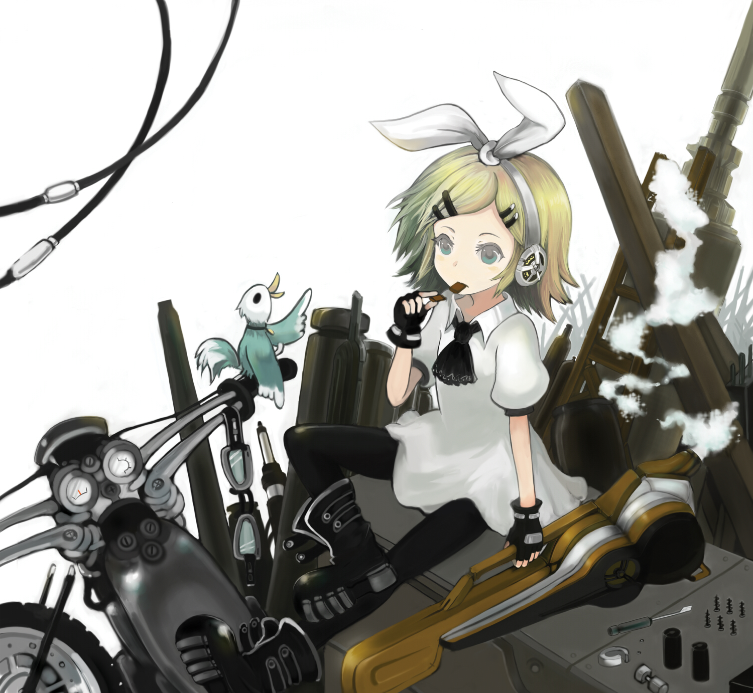 mugichoco, amemiya darumi, the hundred line -last defense academy-, animal ears, black bow, black hair, blue hair, bone, bow, chibi, dog ears, dog tail, face piercing, hands up, lip piercing, long sleeves, looking at viewer, multicolored hair, piercing, pink thighhighs, pleated skirt, safety pin, shirt, skirt, striped clothes, striped shirt, tail, thighhighs, twintails, white background