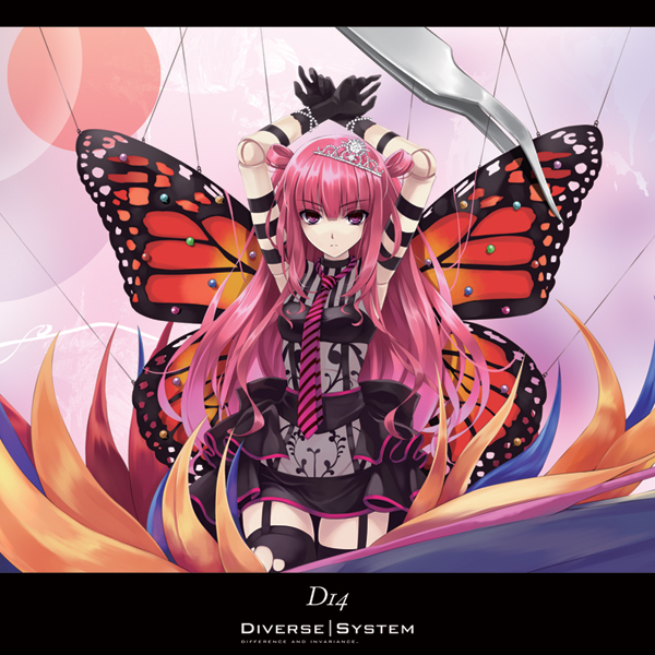 1girlarthropod girlblack thighhighsblunt bangsbugbutterflybutterfly girlbutterfly wingscowboy shotcrowndollfemale focusgarter strapsglovesinsectinsect wingslong hairlooking at viewernecktiepink eyespink hairred necktiesidelockssolothighhighstwo side upwingszettai ryouiki