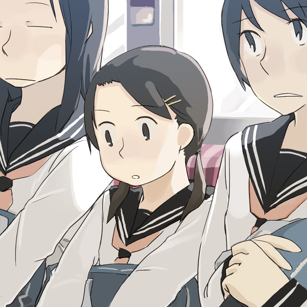 bagblushbrown hairgirl sandwichhair ornamenthaircliplong hairneckerchiefred neckerchiefsandwichedschool uniformserafukuside-by-side