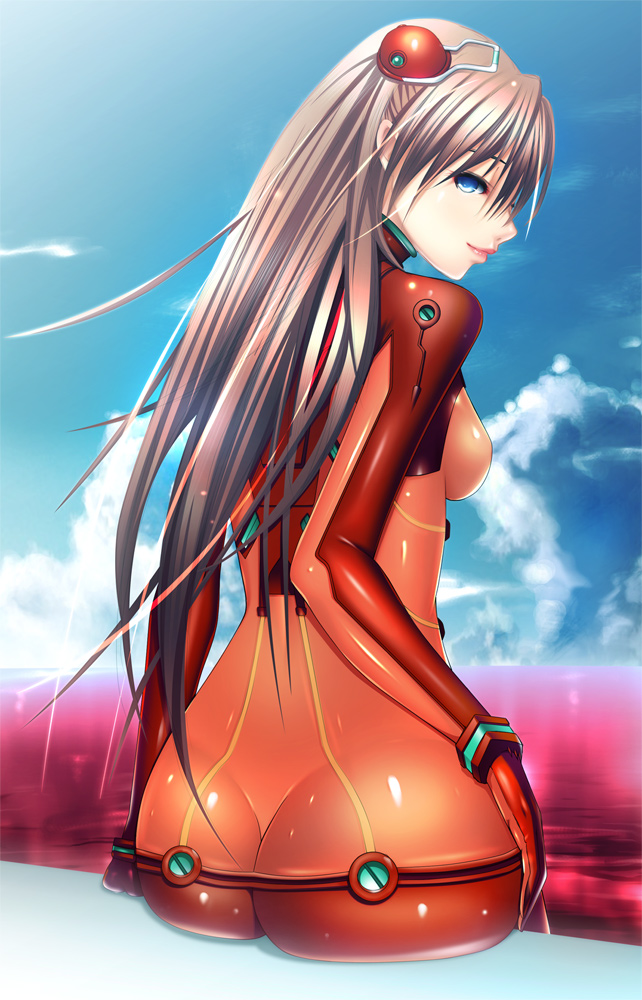 00s1girlassbackblue eyesbodysuitbrown hairbutt crackfemale focusfrom behindlong hairlooking backmecha pilot suitplugsuit (evangelion)solotest plugsuit (evangelion)