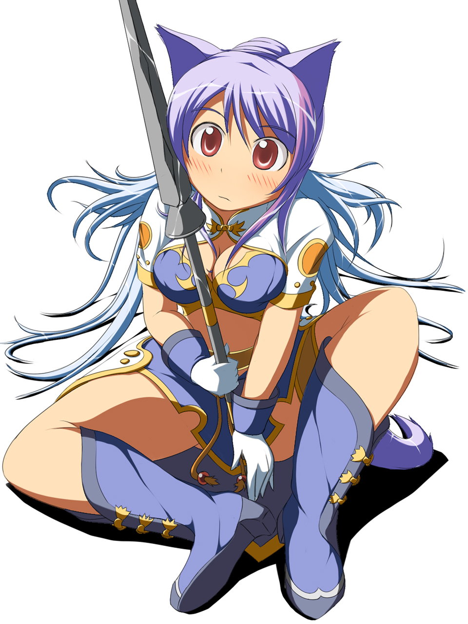 00s1girlanimal earsblue bootsbootsdog earsfemale focuskemonomimi modeknee bootspolearmpurple hairred eyessimple backgroundsittingsolospearweapon