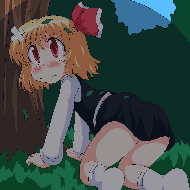 1girlbandagesblonde hairblushdarknessfemale focusforesthair ribbonnatureoutdoorsred eyesribbonshort hairskysockssolotearstree