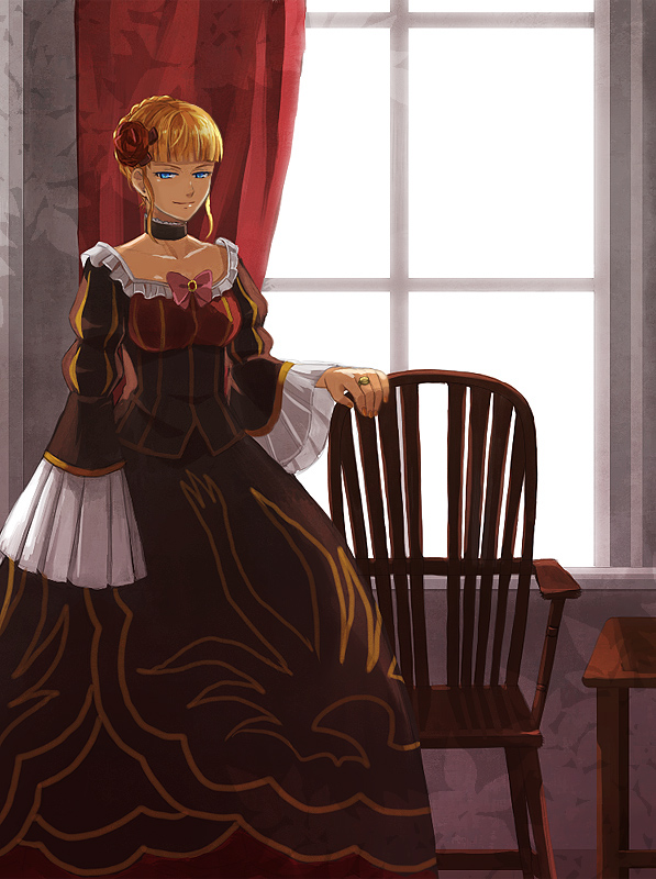 00s1girlblonde hairblue eyesbowchairchokercurtainsdressfemale focusfrillshair ornamentjewelrypink bowringsmilesolowindow