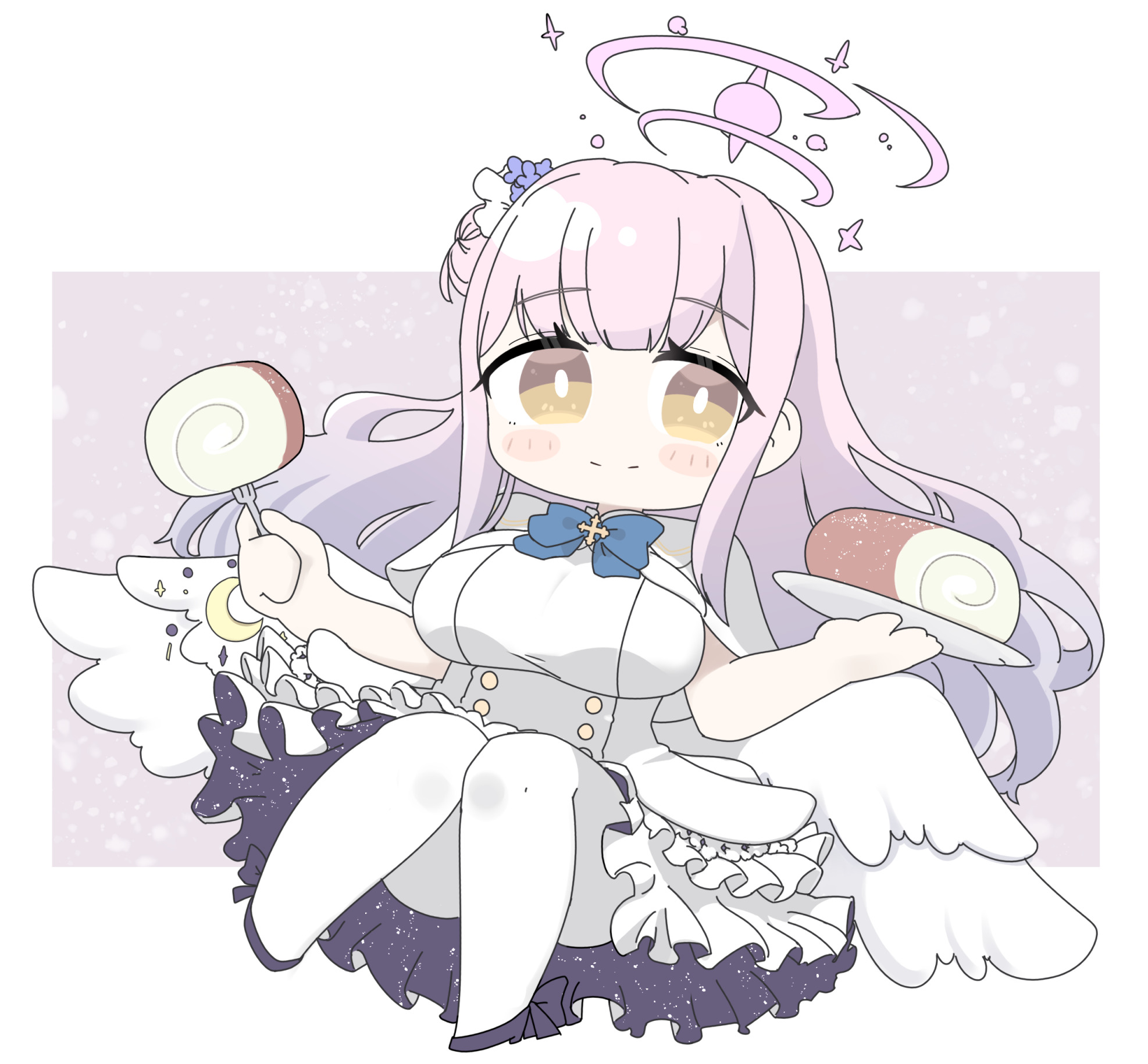 1girlblack shoesblue bowblue flowerblush stickersbowbreastsbrown eyescakecapeletchibiclosed mouthconvenient legcrescentdressflowerfoodforkfrilled dressfrillsfull bodyhair bunhair flowerhair ornamenthaloholdingholding forkholding plateknees together feet apartlarge breastslong hairpantyhosepink hairplateshoessingle side bunsmilesoloswiss rollvery long hairwhite capeletwhite dresswhite pantyhosewhite wingswings
