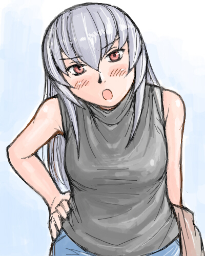 00s1girlaged upblushcasualfemale focushand on own hiplong hairred eyesshirtsleevelesssleeveless shirtsolo