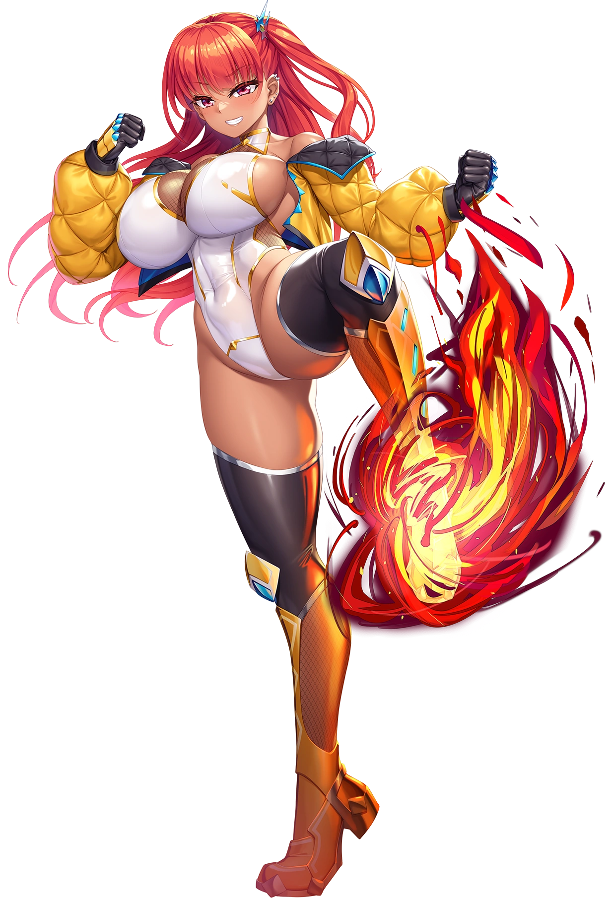 1girlassbreastscleavageclenched handscurvydark skindark-skinned femalefireglovesgrinlarge breastsleg liftleotardlong hairlooking at viewerorange hairred eyesrevealing clothessmilestandingstanding on one legthick thighsthighsthong leotardtransparent backgroundwhite leotardwide hips